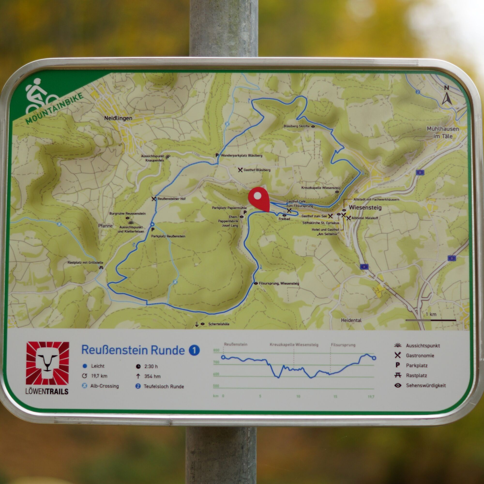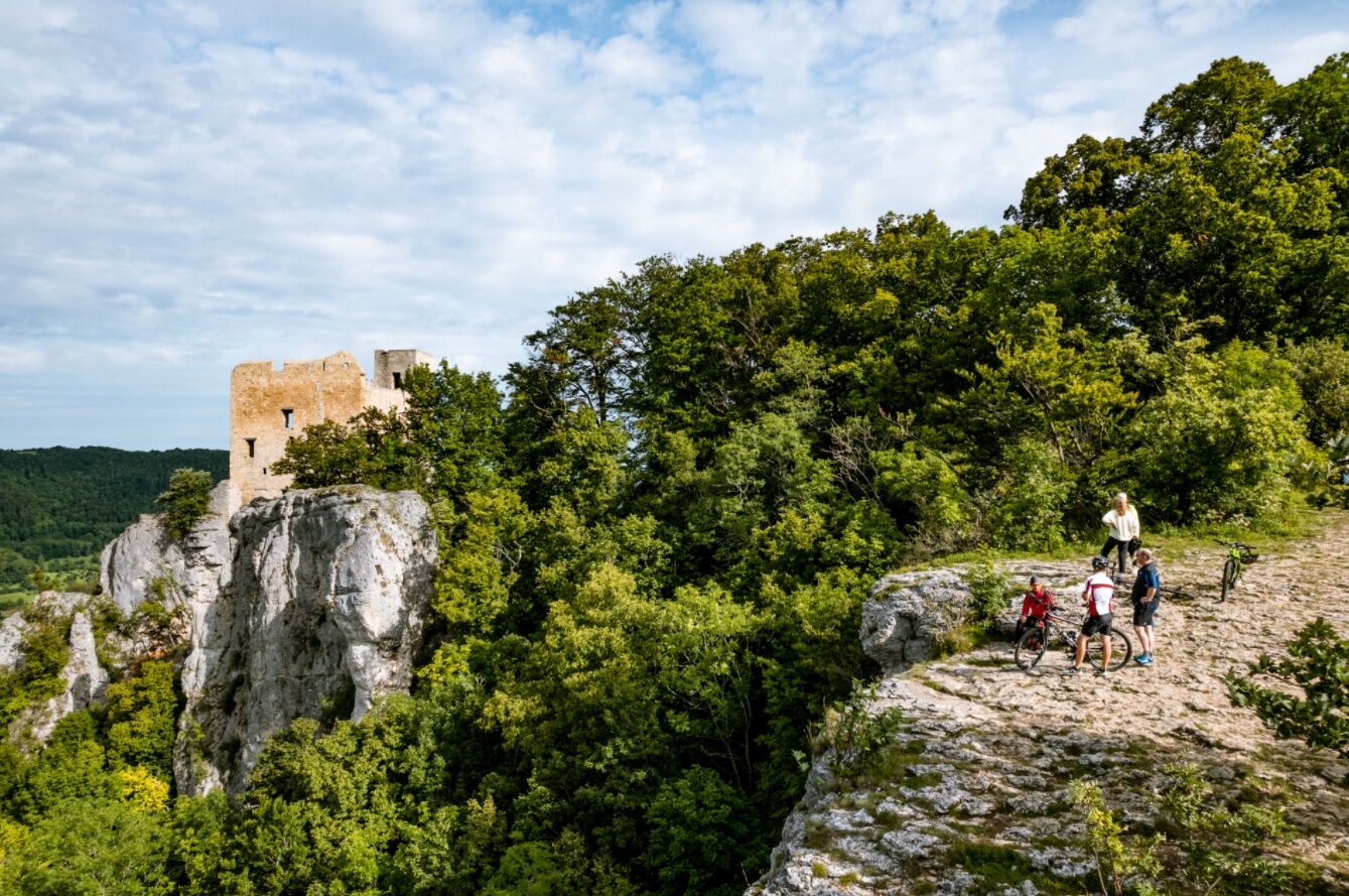 From the Reußenstein parking lot, which is optimally accessible by the RadWanderBus on Sundays, the impressive ruin is just a stone's throw away. It majestically towers over the towering rocky ridge at the northern edge of the Swabian Alb. It is one of the most beautiful castle ruins of the region with a magnificent view into the Neidlingen Valley. The actual route initially passes the Reußenstein manor along the border of the Swabian Alb biosphere reserve towards Bläsiberg. From there, we follow the trail over the flat Alb plateau before descending shortly after the Fohlenhaus into the Schöntal. After a short ride on an asphalted path, the route leads us back up to the Lammwirt pond. From here, the route runs at mid-height below the Sommerberg with repeatedly beautiful views of the small town of Wiesensteig located in the valley. After the Katzenfelsen, it goes downhill into the valley, past the Wiesensteig outdoor pool, which invites a refreshing break, in the direction of the paper mill. We continue to the next highlight of the route: the source of the Fils. Upon arrival, beside a shelter and two barbecue spots, an impressive backdrop of meadows, forests, and the young Fils awaits us. Through the romantic Hasental, we return with a moderate ascent back to the Alb plateau and shortly afterward reach the starting point of our round.