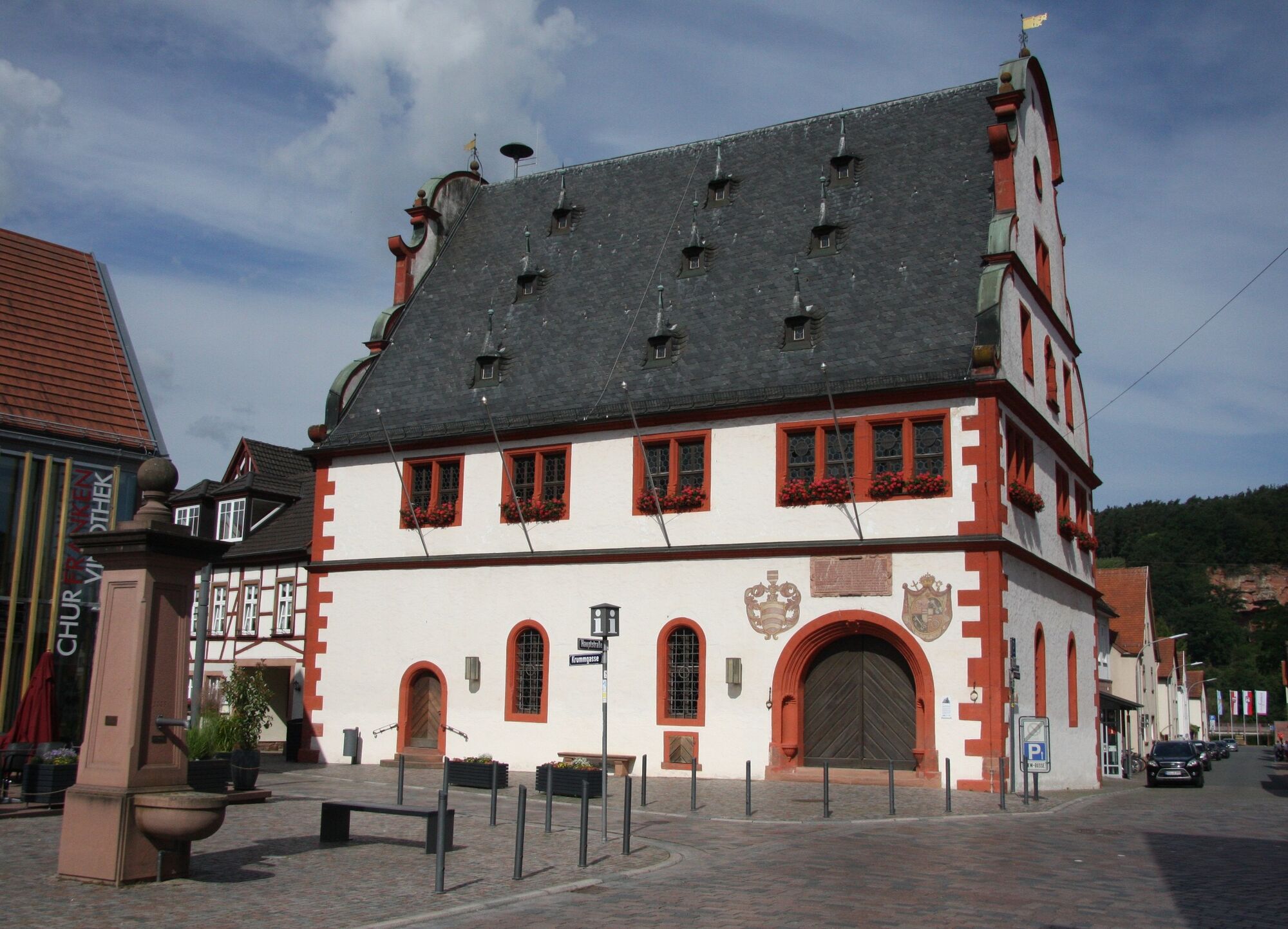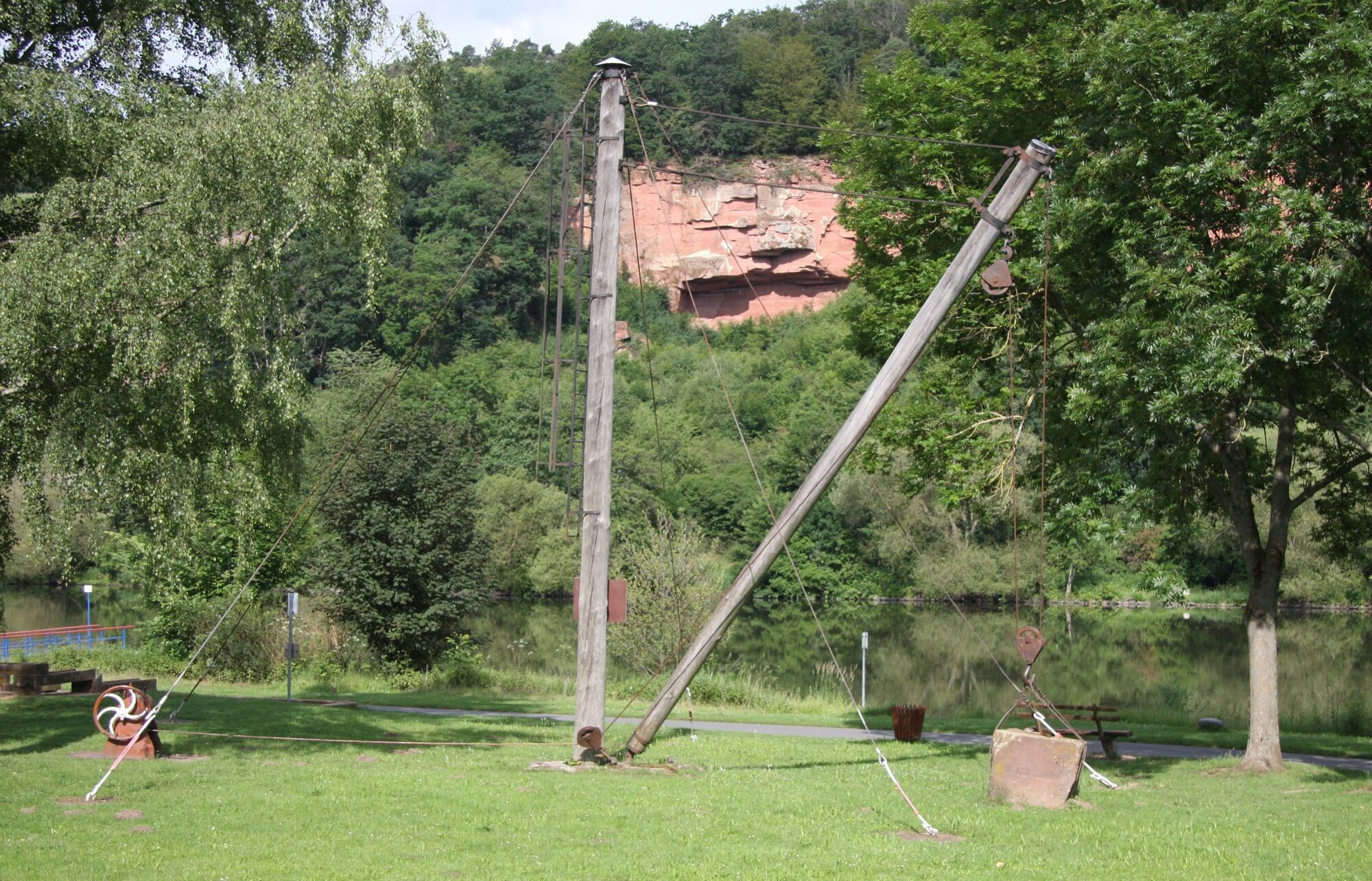 Der Radweg führt zur Fußgängerbrücke über die Erf und wieder zum Flussufer. Er führt vorbei am Derrick-Kran, der in den Brüchen und Werkplätzen zum Umsetzen und Verladen schwerer Blöcke und Werkstücke eingesetzt war und nach seiner Restaurierung 2022 in der Nähe der alten Fährstelle einen neuen Platz an historischer Stelle finden wird. Denn am Mainufer lagen die Werkplätze der Bürgstädter Steinmetzfirmen. Das Foto zeigt ihn noch an seinem alten Platz. Der Weg unterquert die Umgehungsstraße und führt ins Zentrum zum 1592 fertiggestellten Rathaus mit seinen Renaissance-Giebeln und der Gewölbehalle. Wir erreichen dann die 1220 als Wehrkirche erbaute und in mehreren Abschnitten erweiterte Margarethenkirche, die mit Torhaus und Kreuzgruppe im „Kirchhof“ ein stimmungsvolles Ensemble bildet.