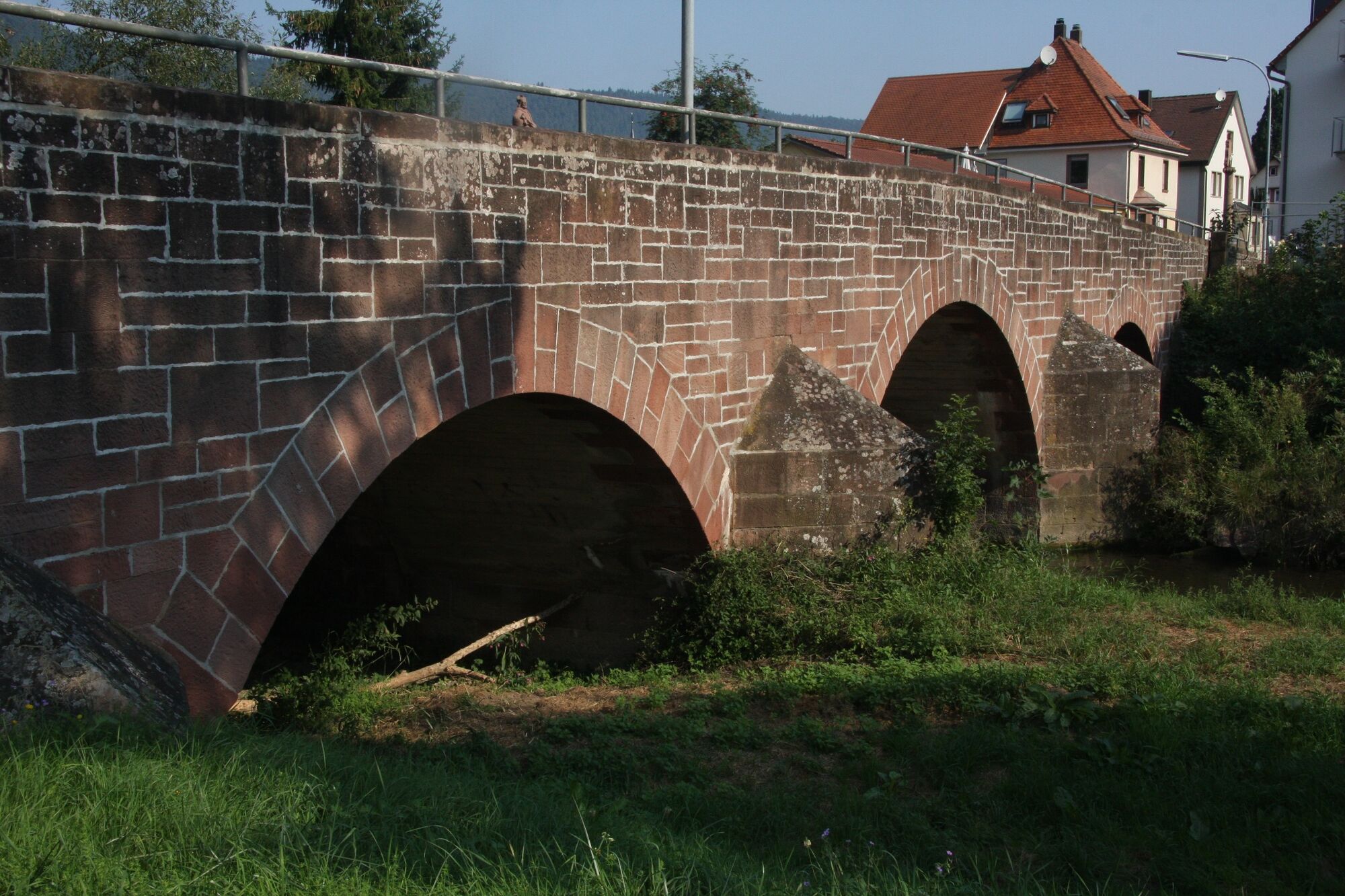 Die Straßenbrücke über die Erf wurde 1538 nach einem Hochwasser neu errichtet, 1732 beim sogenannten „Michelswasser“ erneut zerstört und 1749 durch die jetzige dreibogige Brücke aus Sandstein ersetzt. Von dort aus führt der Weg zum Ausgangspunkt und auf die andere Mainseite.