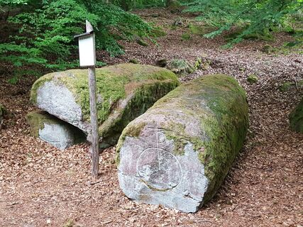 Für am Sandstein und der Natur Interessierte, ist die Erweiterung auf den „Bürgstadter Berg“ fast schon ein „Muss“, auch wenn etliche Höhenmeter zu bewältigen sind. Wir folgen dazu dem Europäischen Kulturweg zur „Stutz-Kapelle“, und dann dem „Jugendwanderweg“, der sich gegen den Uhrzeigersinn um den Berg windet. Die „Centgrafenkapelle“ blieb wegen des Ausbruchs des 30-jährigen Krieges unfertig. Der Ausblick ins Maintal dort lohnt jeden Schweißtropfen. 2020 fertigten Schüler unter Anleitung eines Bildhauers Skulpturen aus Sandstein zur Nibelungensage, die wir ebenso passieren wie Relikte der Sandsteinnutzung: Unfertige oder schadhafte Rundsäulen, Mühlsteine und Sarkophage. Diese wurden aus dem weitgehend freiliegenden Felssandstein gewonnen und vor Ort bearbeitet. Wurden dabei Risse oder Schadstellen entdeckt, ließ man die Rohlinge liegen. Der Weg folgt dem keltischen Ringwall, der, einst Fliehburg, später zur Siedlung wuchs, ehe diese aufgegeben wurde und verfiel. Das restaurierte Osttor macht die einstige Wehrhaftigkeit nachvollziehbar. Wer sich den Weg zum Gipfelkreuz sparen will, kann sich wenige Meter nach der Toranlage gleich nach links wenden, wo die sogenannten „Heunesteine“ von der unfertig gebliebenen Arbeit der Steinmetze künden. In etlichen Schleifen und Kehren windet sich der Weg dann wieder ins Tal und zum Ort.