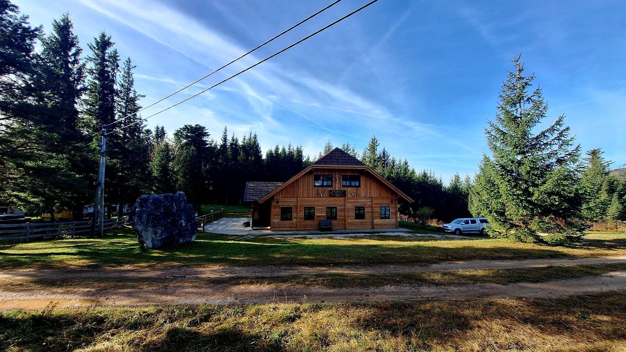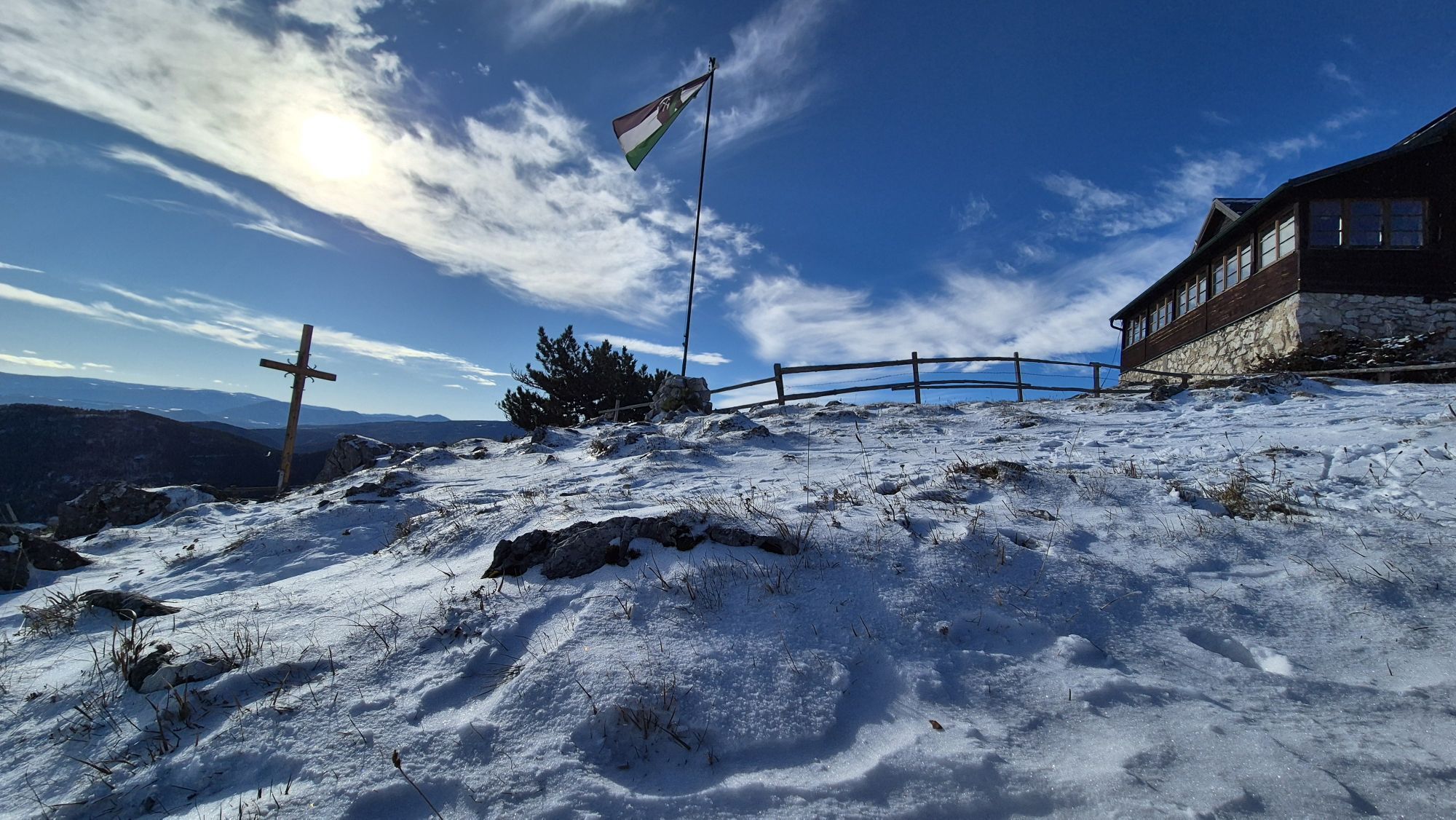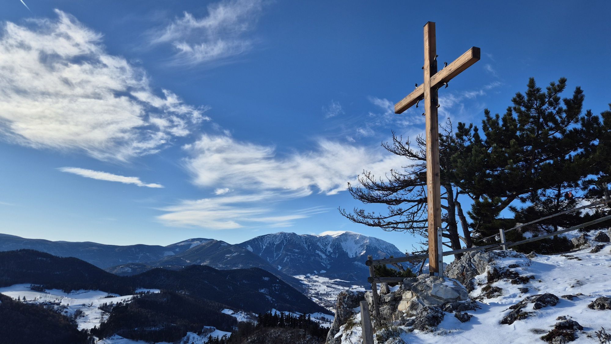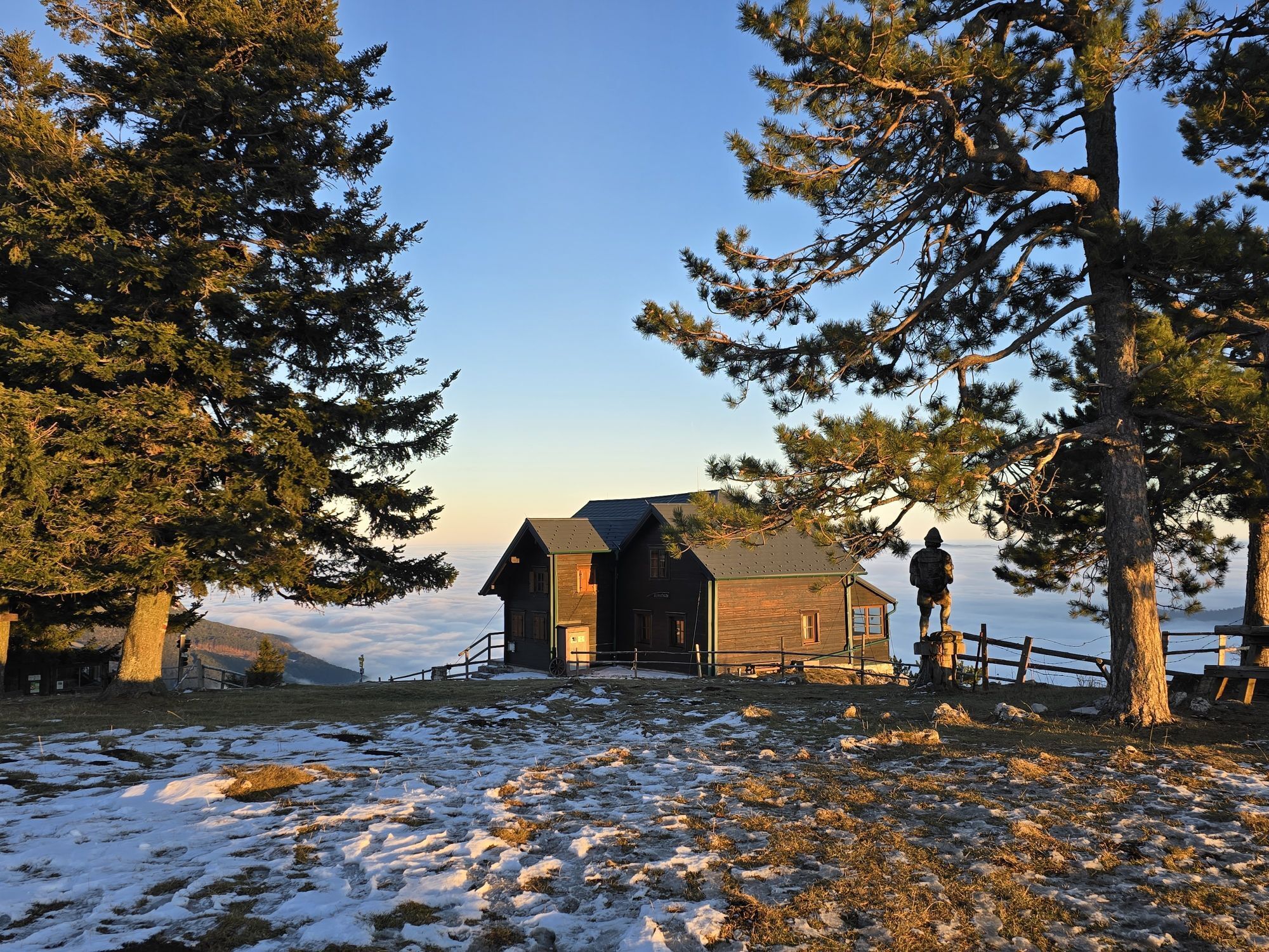 The Gelände is a western spur of the Hohe Wand. The municipality of Grünbach am Schneeberg lies at the foot of the Gelände and is thus an ideal starting point for hikes up the mountain. You can also visit the mining museum here. You reach a parking lot via Wandstraße from which various hiking trails lead away. From here, for example, you can also go via a forest path to the Pension Seiser Toni. Our hike leads us up the forest road to our first stop, the Scheimhitt'n. At the Rastkreuzsattel at 876 meters elevation, the hut invites you not only to rest but also to celebrations and overnight stays. Hungry hikers strengthen themselves with game specialties from the house's own enclosure. To the east, you can hike up the Hohe Wand from here. In the opposite direction, it continues onto the Gelände. Either comfortably over the forest road or, as shown on the map, over a rocky path, you finally reach the Geländehütte at 1023 meters. A three-meter tall bear statue points here to the nearby bear cave. At the Geländehütte, diligent hikers can refresh themselves at weekends from Easter to December and enjoy the 360-degree panoramic view over the Schneeberg and the southern Vienna Basin to the Pannonian Plain.