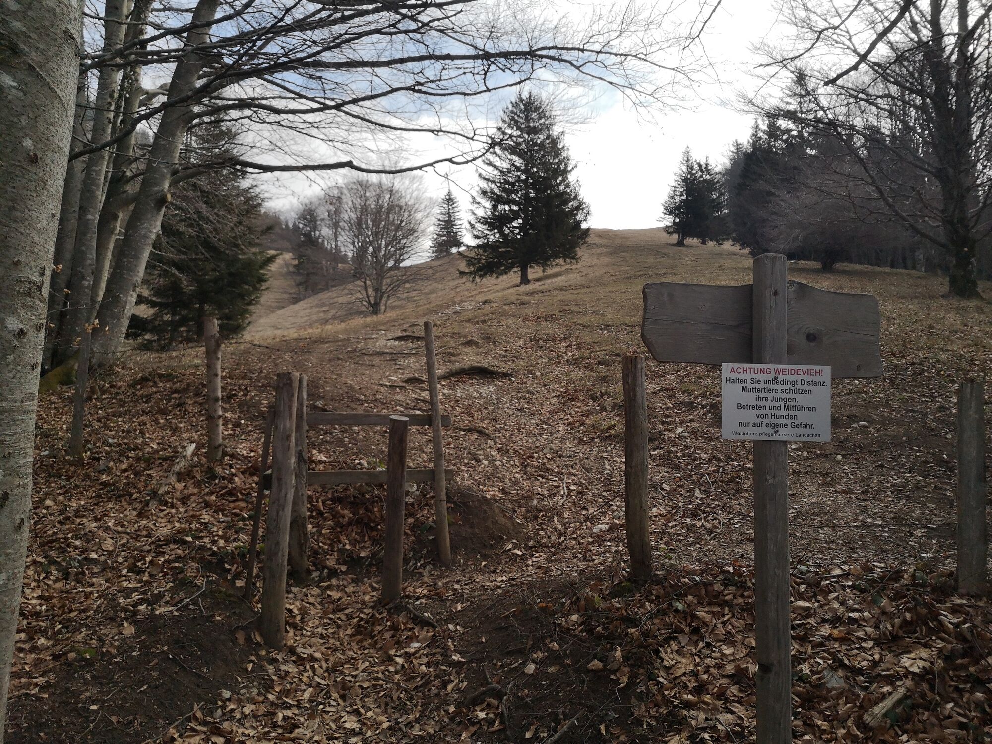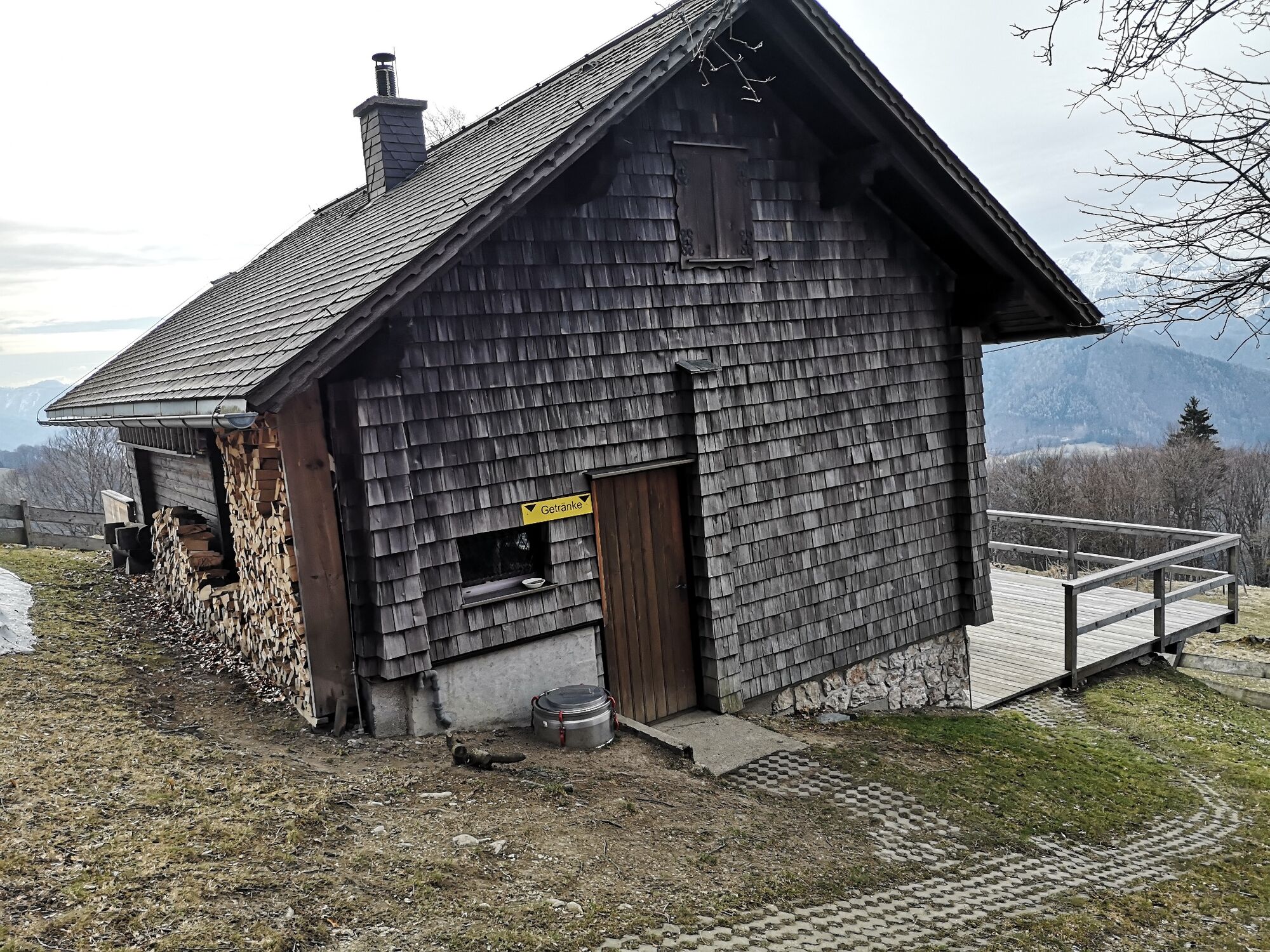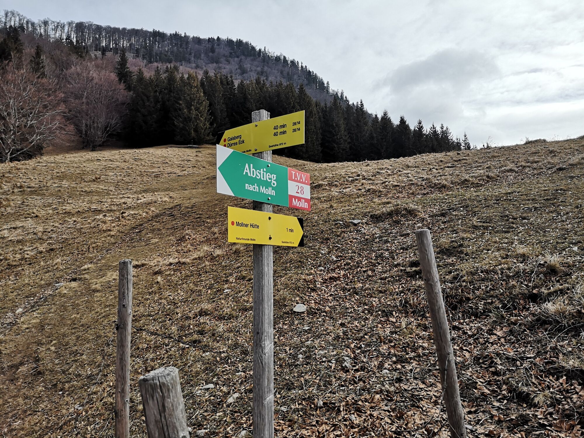 Back to the junction and then continue to follow the Salzsteigweg in the direction of Gradau until you come to a farm with a stud farm on the left after a total of 5 km at the intersection with Haunoldmühlstraße, turn right here in the direction of Molln (sign “Sonnseite Gstadt”). Then you walk a bit along the asphalt road past the entire Bernegger site on the right, turn left at the end of the site up the road (Güterweg Hageleben) and then immediately left again, where the asphalt road turns into a forest road after about 100m. A few 100m further on you can see a fodder grip on the top left, here you have to turn right into the initially quite inconspicuous hiking trail, directly past the fodder grip and follow the path straight up until you come to a forest road further up. Turn right here (see sign "Mollner Hütte"), after a while along the forest road there is a fork, keep left here, at the end of this road a hiking trail leads up to the left through the forest and at the end a bit over a meadow up to the Mollner Hut.