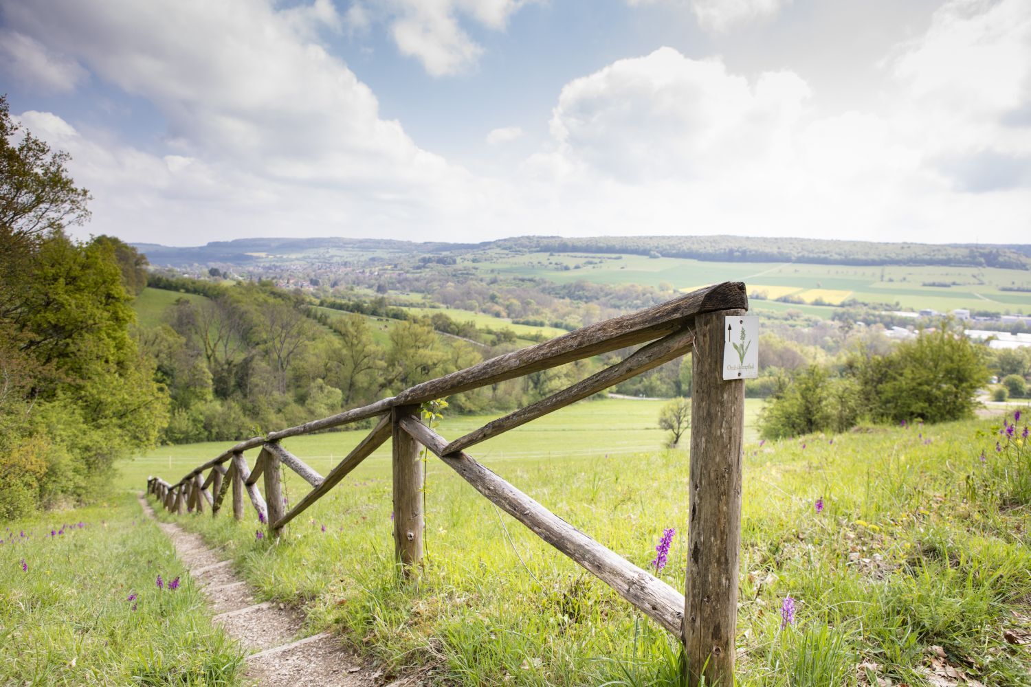 Parts of the area have been under protection since 1957. The new Orchid Trail features ten stations showing special species in the area, why they occur here specifically, and why they can only be preserved with appropriate care. Besides the orchids, the experience trail also shows other special species from the groups of butterflies, birds, and grasshoppers. The smaller circular trail is about 1.8 km long and includes seven stations; if you choose the detour to the Kalkquellsumpf, you can see all ten stations walking about 2.8 km. The path has some ascents and descents and is mostly only a narrow trail. Good footwear is therefore recommended.