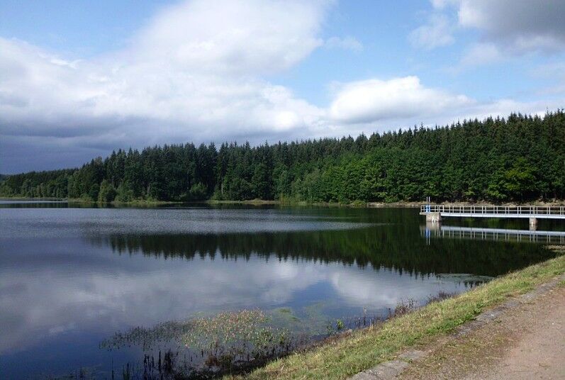 The start and end of this easy but beautiful hike are at the parking lot of the Naturresort Schindelbruch at the foot of the Auerberg. At the beginning, you pass the nature trail and then reach the parking lot at the Auerberg. At the end of the parking lot, a narrow path runs parallel to the road. This is crossed, and after a short stretch through the forest, you turn right to reach a meadow. You then arrive at the Frankenteich; it is best to circle it counterclockwise. At the pond itself, there are beautiful views, ideal for a rest.