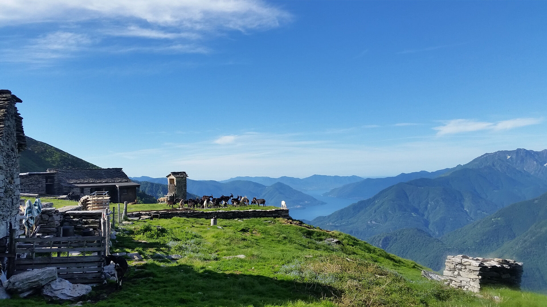 One could in principle start right from the shore of Lake Maggiore at Locarno, at barely 200 meters altitude. Yet a funicular, an aerial cableway, and a chairlift spare us the first 1500 meters of ascent. The experience of the Via Alta Vallemaggia thus begins on the panoramic Cimetta – a summitlet compared to what still awaits us. After a leisurely pause, we turn our backs on the bustling lakescape of the Verbano and set off on the great adventure that will lead us directly into the heart of the Ticino Alps over several days. The first stage presents itself as a worthy start, a long ride over ridges and slopes between Vallemaggia and Verzasca. At the end of a memorable day, the Capanna Nimi welcomes us, where two ancient, precious alpine traditions are lived and cherished: goat farming and hospitality.