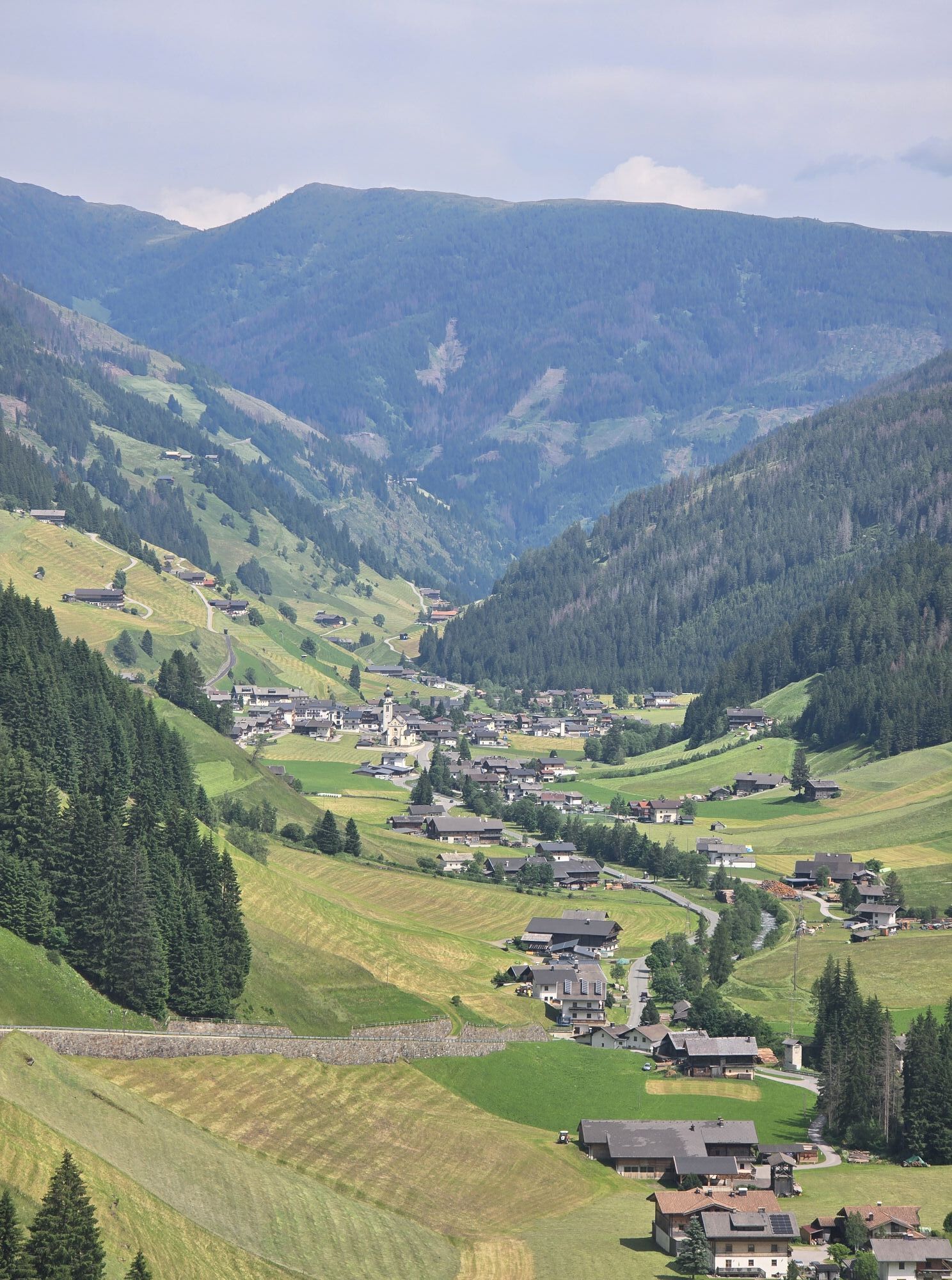 Wir wandern vom Dorfplatz ausgehend an der Pfarrkirche vorbei und überqueren die Brücke, die zur Prantersiedlung führt. Beim Pranterhof, ein kurzes steiles Stück aufwärts,kommen wir zum schattseitigen Wanderweg der taleinwärts führt. Da der Weg meist am Waldrand verläuft, hat man einen schönen Ausblick auf die Bauernhöfe des Hochberges und über das ganze Dorf. Nun geht es links weiter. Ein alter Steig, der „Schmugglersteig“, führt durch den Wald zum Gasthof Bad Kalkstein, der früher ein Kurbad mit einer schwefelhaltigen Quelle war. Auf dem „Schmugglersteig“ haben Bauern heimlich ihr Vieh über die nahe Grenze nach Italien getrieben, weil sie den Viehhandel mit den Gsieser Bauern nach der Abtrennung Südtirols 1918 nicht aufgeben wollten. Nach dem Gasthof Bad Kalkstein geht es den Bach entlang zum Ortsteil Kalkstein. Dort lädt der Alpengasthof „Badl-Alm“ zum Rasten ein. Wir gehen aber weiter bis zur Alfenalm die wir in ca 15-20 Minuten erreichen.Dann wieder zurück hinunter nach Kalkstein. Der Weg führt jetzt an den obersten Höfen von Kalkstein vorbei, talauswärts zum Hof Schönegg. Im Volksmund heißt der Weg „Peststeig“. Es heißt, dass die Bevölkerung von Kalkstein während der Pestepidemie aus Angst vor Ansteckung nicht mehr hinunter ins Dorf gelassen wurde. Auf diesem Steig hielten sie draußen beim Hof Schönegg durch Rufen den Kontakt ins Tal aufrecht. Nun geht es abwärts zu den Höfen Schachler, Bodemair, Stuner, Mattn und man kommt schließlich wieder beim Maxerhof an. Ab hier kann man mit dem Wanderbus ins Dorf fahren oder den Weg zu Fuß zurücklegen.